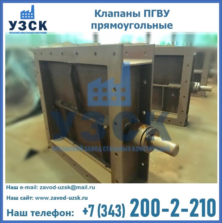 Прямоугольный клапан ПГВУ имеет прямоугольную или квадратную форму, по основному сечению конструкции, на которую устанавливается клапан. Для изготовления в Кокшетау применяются сталь или чугун, в зависимости от модели. Внутри клапана имеется запорный элемент, передвигающийся параллельно общему потоку движения среды. Шибер ПГВУ имеет такую же форму, как и основное сечение. Перемещение створки происходит благодаря возвратно-поступательным движениям.